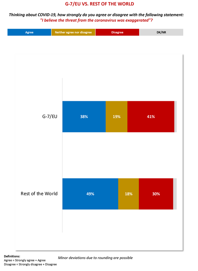 The Middle East (47%) also show high levels of agreement that the threat from COVID-19 was exaggerated. War torn countries – Afghanistan (62%), Iraq (59%) and Syria (57%), where there is a significant threat to life – are the most likely countries in the region to agree the threat was exaggerated.