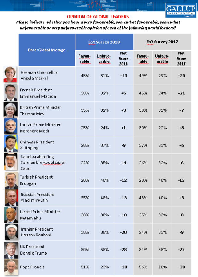 However, as with last year, Pope Frances remains the most trusted leader in the world with a net score of +28 (although even he lost points on last year).