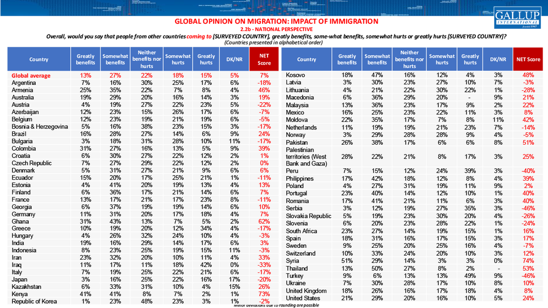 Immigration, by contrast, is generally viewed more favorably. Globally, 40 % believe immigration benefits their country, while 33 % believe it hurts, resulting in a positive global net score of +7.