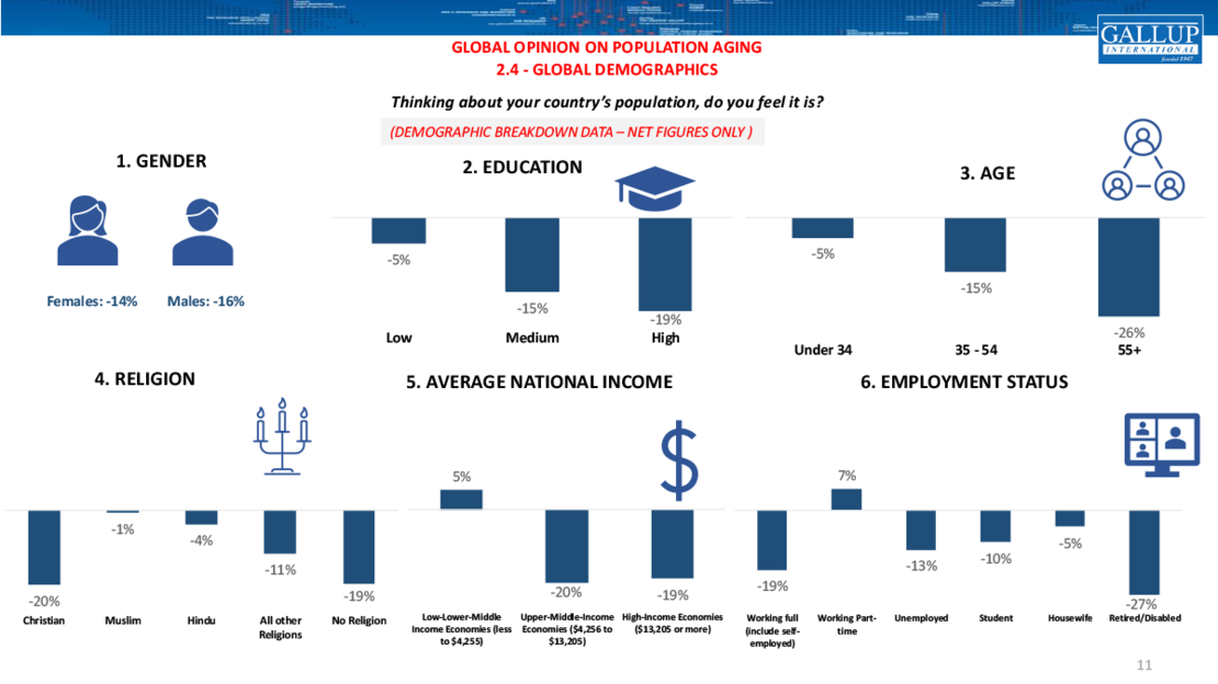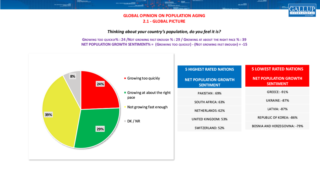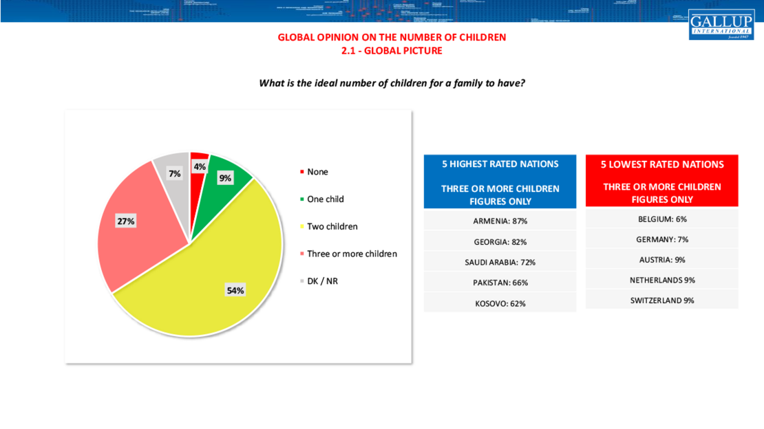 The Gallup International Association End-of-Year (EOY) Survey 2025, the world’s longest-running global public opinion study, has released new findings, covering public opinion in 59 countries on population growth and 61 countries on the ideal number of children. The results reveal a sharply divided world: aging societies fear population decline yet increasingly prefer smaller — and in some cases child-free — families, while faster-growing societies worry about rapid expansion but continue to idealize larger households.