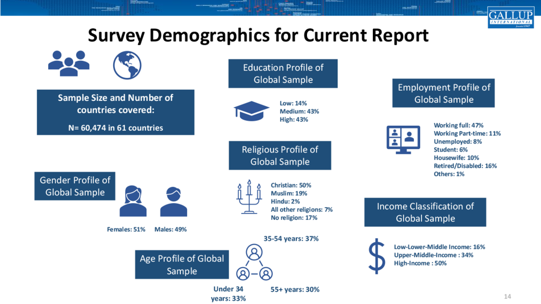 For more than 75 years, Gallup International members have demonstrated their expertise in conducting multi-country surveys on a fully comparable basis, consistently delivering research of the highest methodological quality. Today, the Association brings together over 65 members who together with partners have the capacity to cover more than 130 countries of the world with opinion polling. Each member is a leading national research institute with deep local ex-pertise in research methods, statistical systems, culture, and social context.