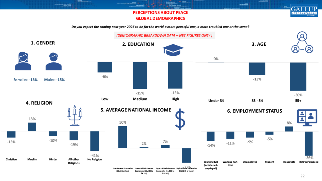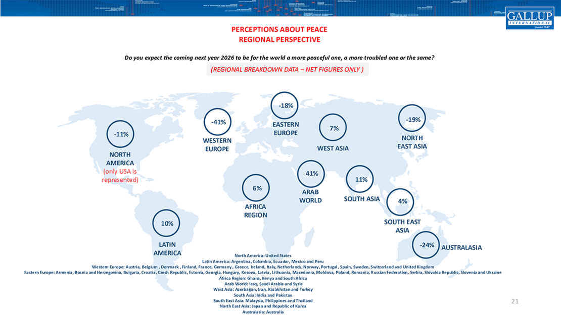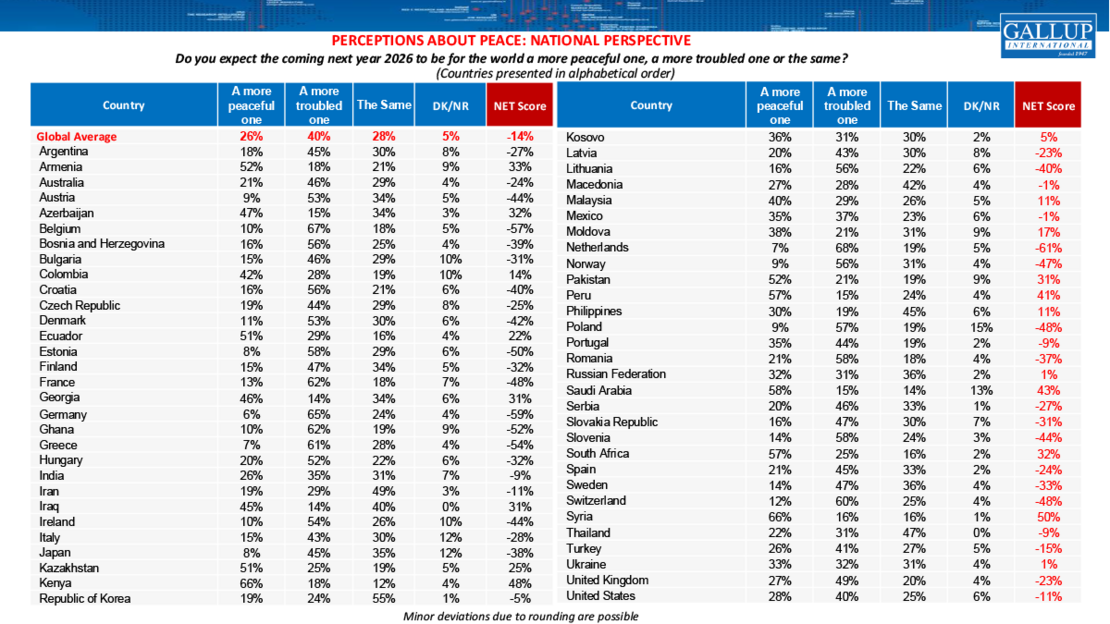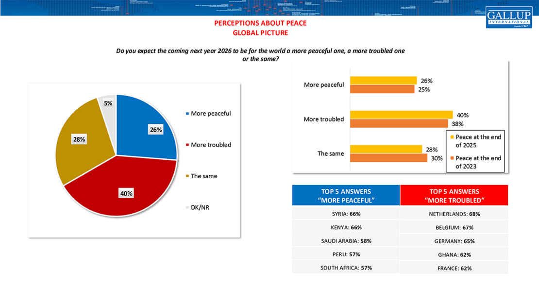 Globally, 40 % of respondents expect the world to become more troubled in 2026, while 26 % believe it will become more peaceful. Another 28 % expect no major change, resulting in a Net Peace score of –14.