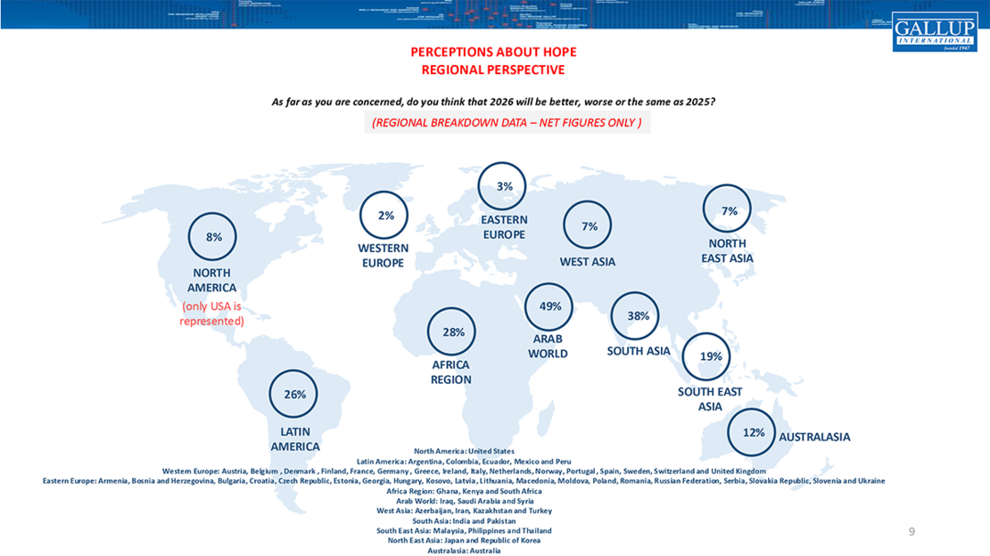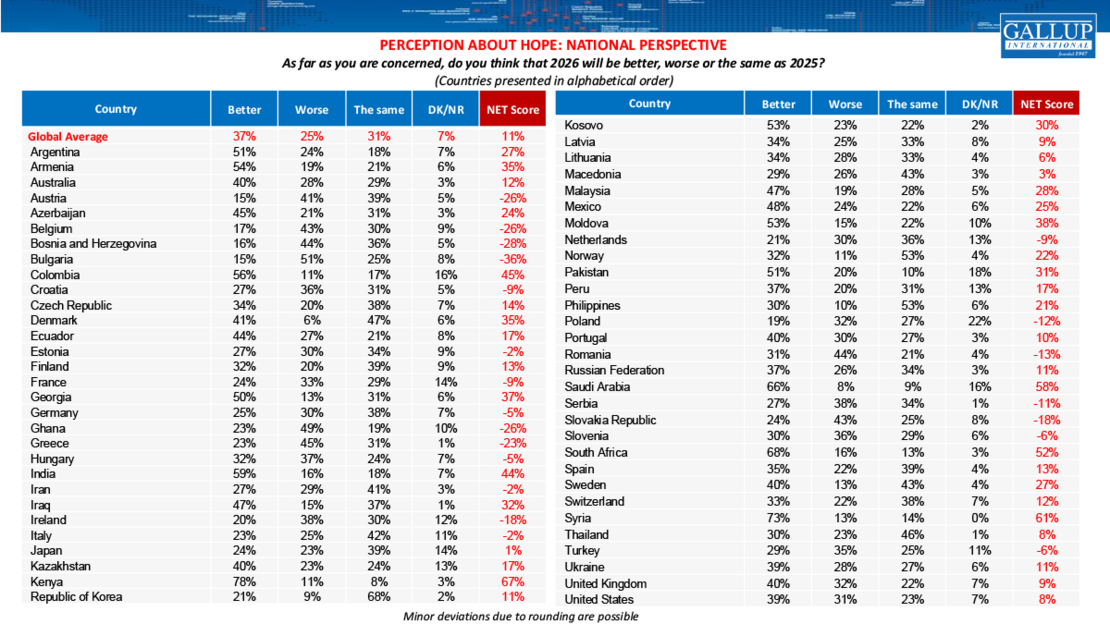 Globally, 37 % of respondents believe that 2026 will be a better year than 2025, while 25 % expect it to be worse and 31 % expect no major change. This produces a Net Hope score of +11, indicating that optimism continues to outweigh pessimism at the global level.
