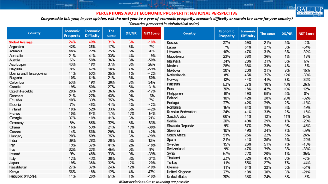 Michael Nitsche, President of Gallup International Association, summarizes the results: “In view of the gloomy economic outlook and widespread concerns about peaceful coexistence in large parts of the world, there will be a greater need for engaged leaders from the areas of business, culture, and politics who can show people a constructive way forward and turn global public sentiment in a positive direction.”