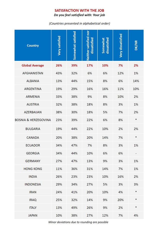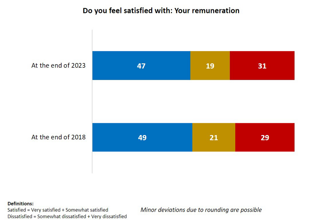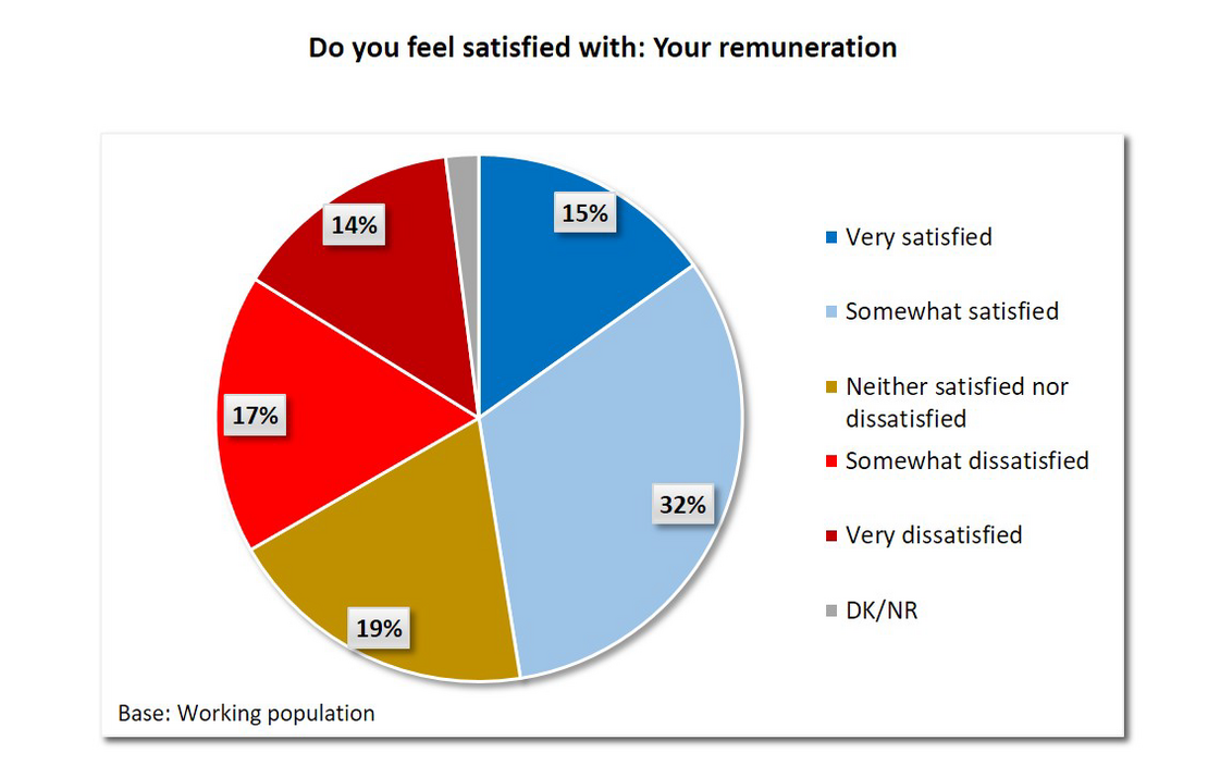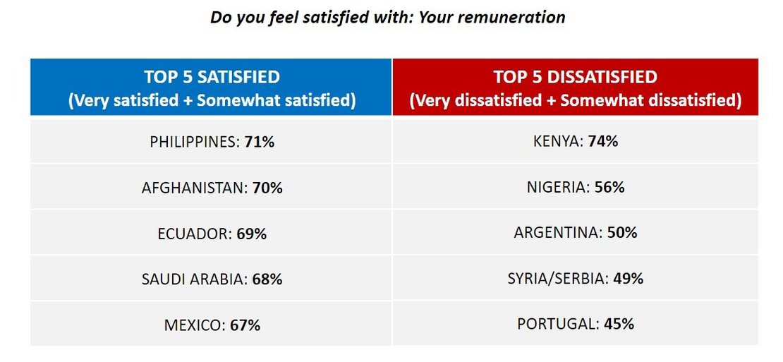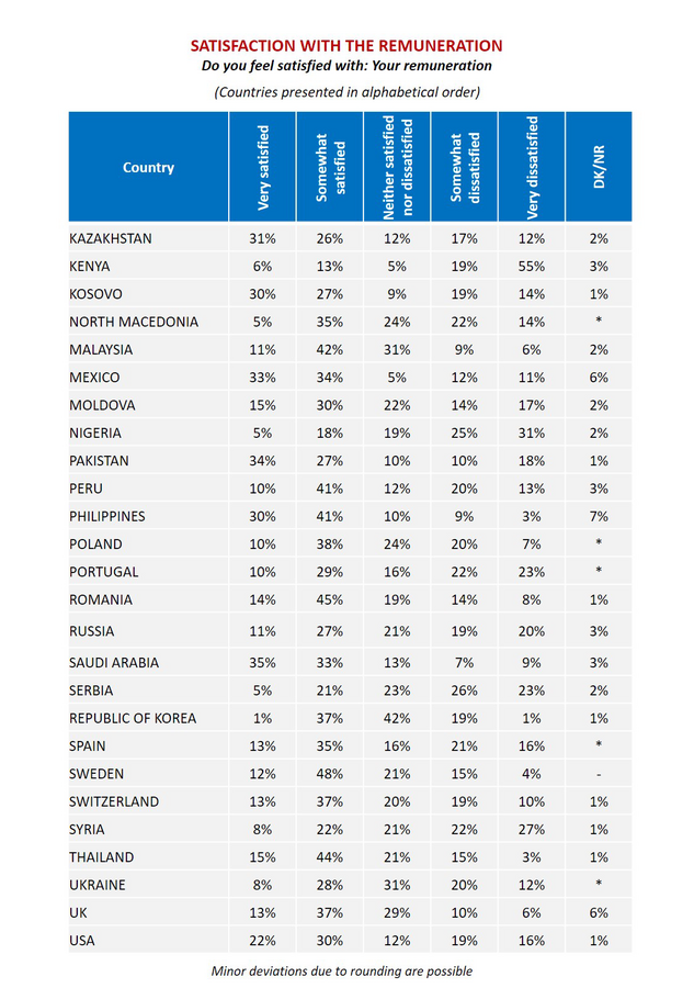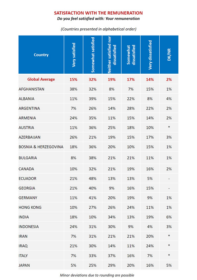 Remuneration satisfaction is not necessarily related to job attitudes. One can be happy with a job, and still not satisfied with what they get from it, and vice versa. Shares of remuneration satisfaction are traditionally lower. The current wave of polling shows that almost half (47%) of working people around the world is happy with their payment, near a third (31%) is however not satisfied and 19% of the respondents are “neither/nor”.