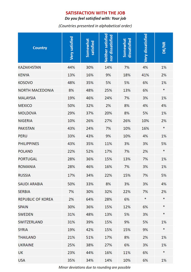 In some African counties for instance people who say they are satisfied with their job are a minority (31%), and those who are not are about a half of all respondents. In India the share (49%) of those who are satisfied with their job is also relatively low compared to the rest of the world. Most happy with their job on the other hand are people in Europe (both EU and Non-EU countries), USA, West Asia, but also Latin America, where shares of people happy with what they do reaches up to 70%.