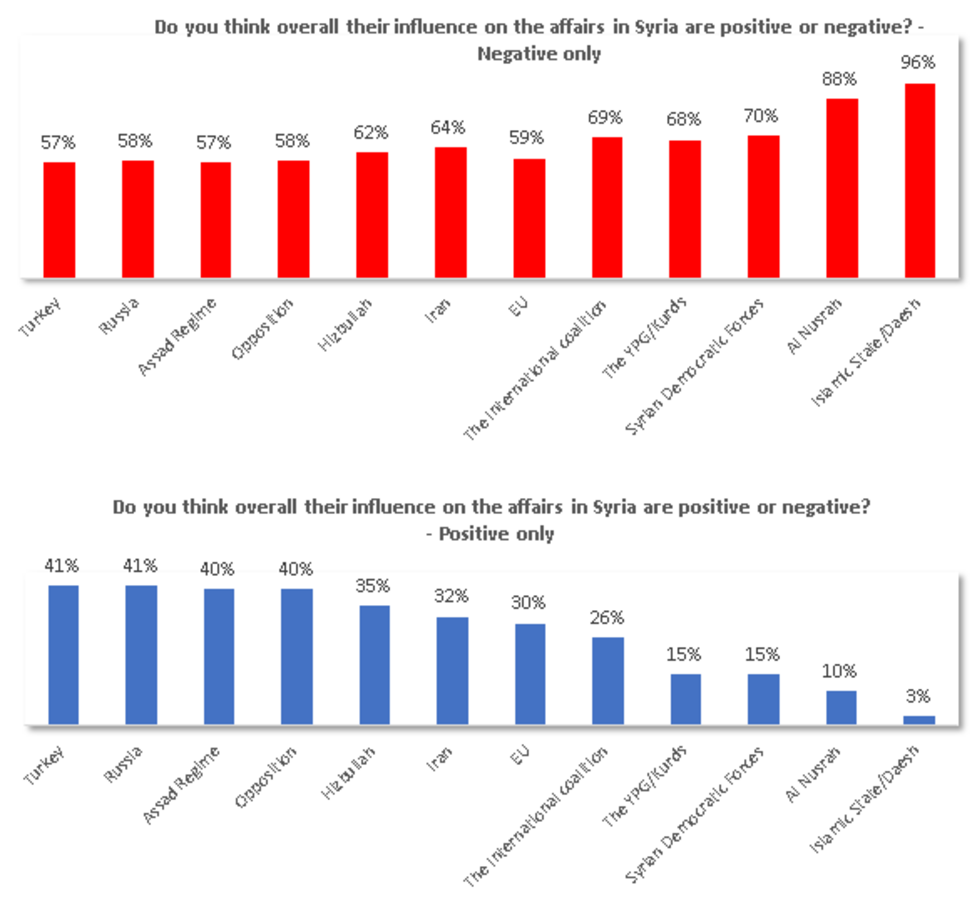 «This is a rare snapshot of national opinion in Syria, and it’s clear from the results that regional experiences are becoming more polarised, and that outside forces in the conflict are overwhelmingly viewed as negative. This poll shows a large increase in belief that Bashar Al-Assad will likely be the victor at the end of the conflict...something which will do very little to encourage the millions who have fled to return. There is no immediate light at the end of the tunnel as Syrians enter a 7th year of conflict.»