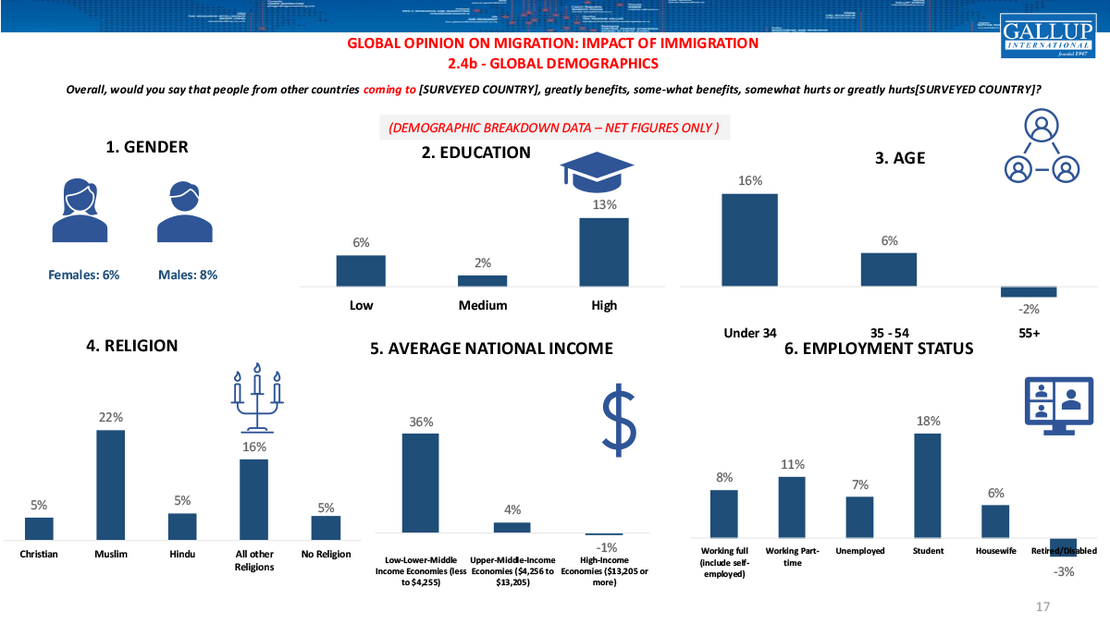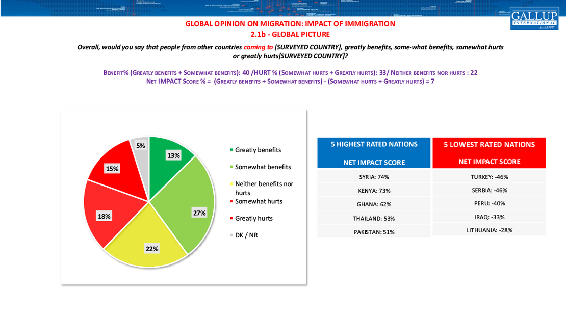 Immigration, by contrast, is generally viewed more favorably. Globally, 40 % believe immigration benefits their country, while 33 % believe it hurts, resulting in a positive global net score of +7.
