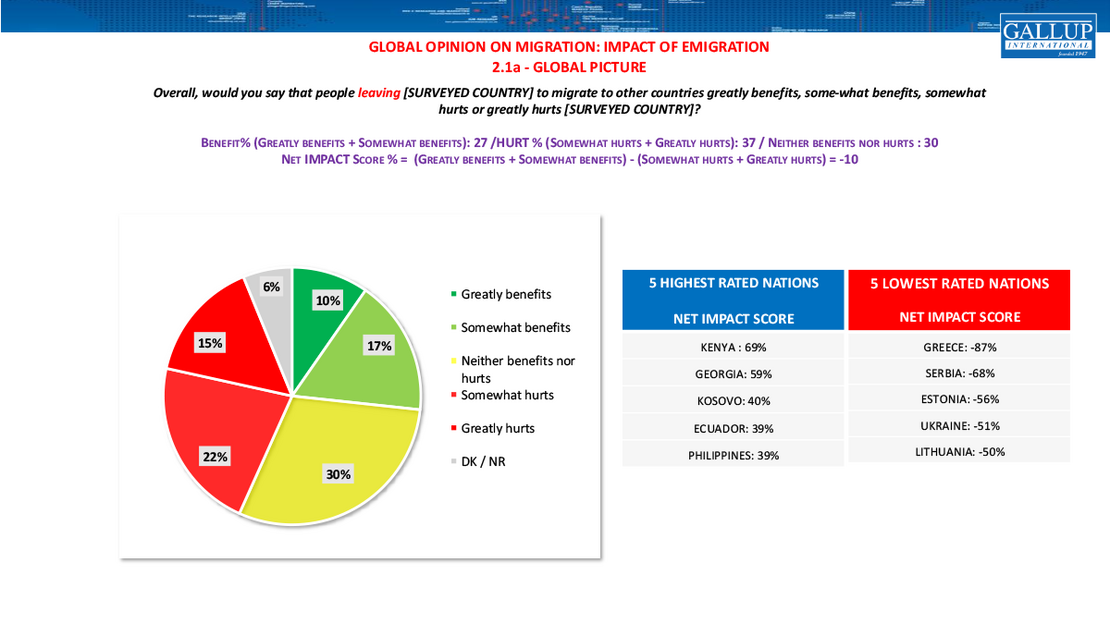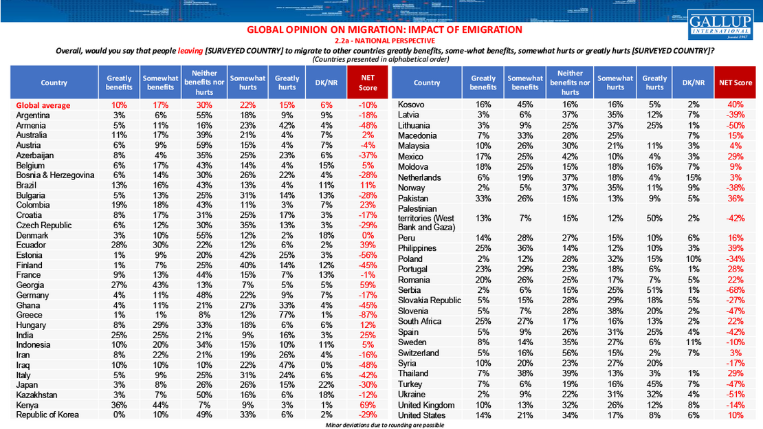 Positive views of migration are concentrated in a smaller set of countries. On immigration, the strongest net support is seen in Kenya (+73 %), Syria (+74 %), Ghana (+62 %), Thailand (+53 %) and Pakistan (+51 %). Support for emigration is led by Kenya (+69 %), Georgia (+59 %), Kosovo (+40 %), the Philippines (+39 %) and Ecuador (+39 %).