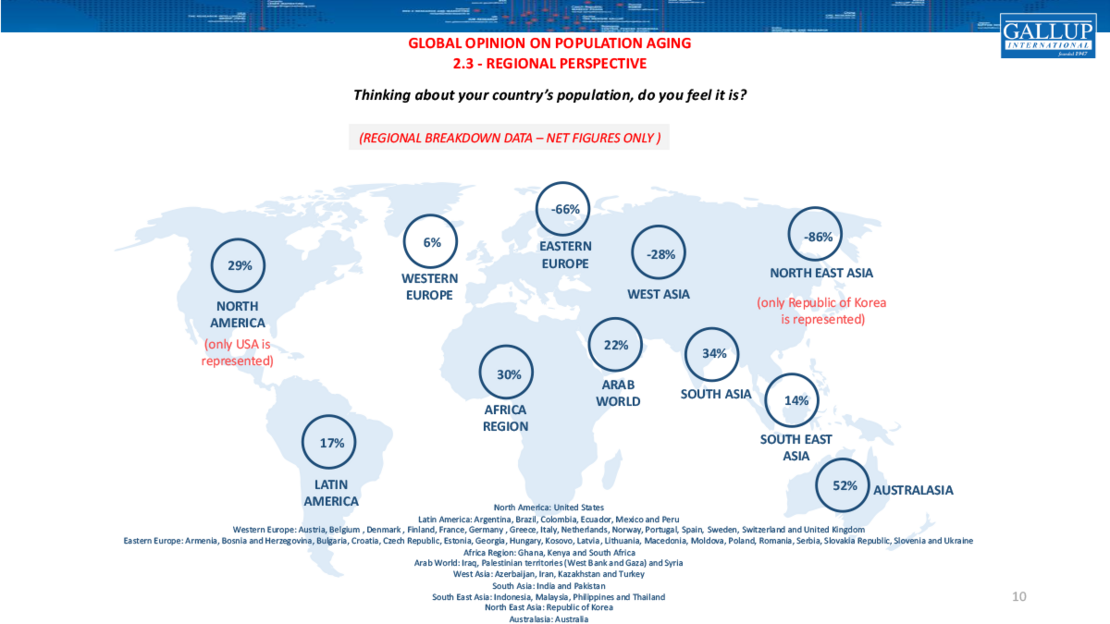 Regional patterns show Eastern Europe (-66) and Northeast Asia (-86) expressing the deepest concern about shrinking populations. Africa (+30) and South Asia (+34) are more likely to feel population growth is too fast. Western Europe (+6) reflects mild concern about growth, while Australasia (+52) shows the strongest feeling that their population is growing too quickly.